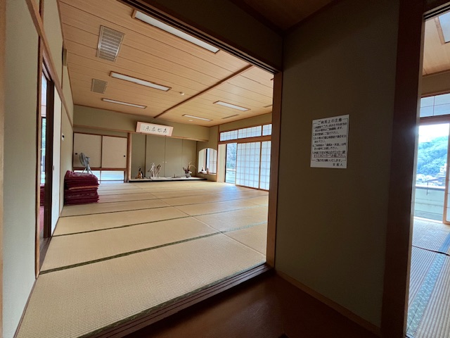 出入り口にあるサンダルを履いて、70段ほど屋根付き階段を上がったところに、ちょっとした休憩スペースと四季風呂