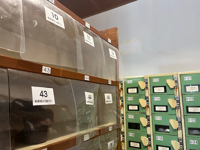 靴は平置きの靴棚(ビニールカバー付)に置くか、靴箱ロッカー(100円リターン式)に収納します。