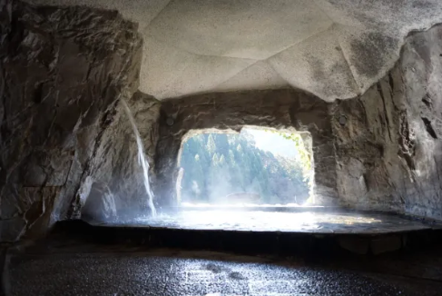 洞窟風呂は、洞窟入口から20mほど先に、打たせ湯のようにドバドバ注がれるお湯と差し込む陽光の美しさが印象的。
