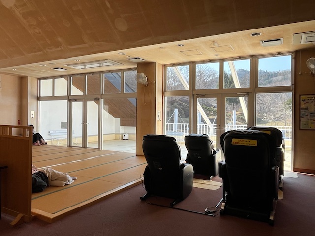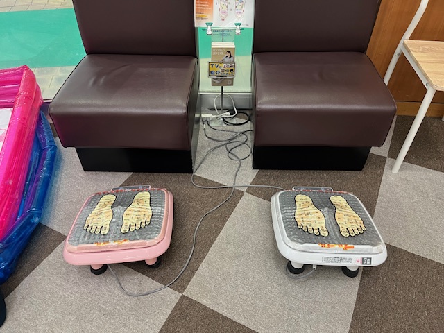 ・1階の休憩スペースにマッサージチェアや無料の足マッサージャーが設置されていました。