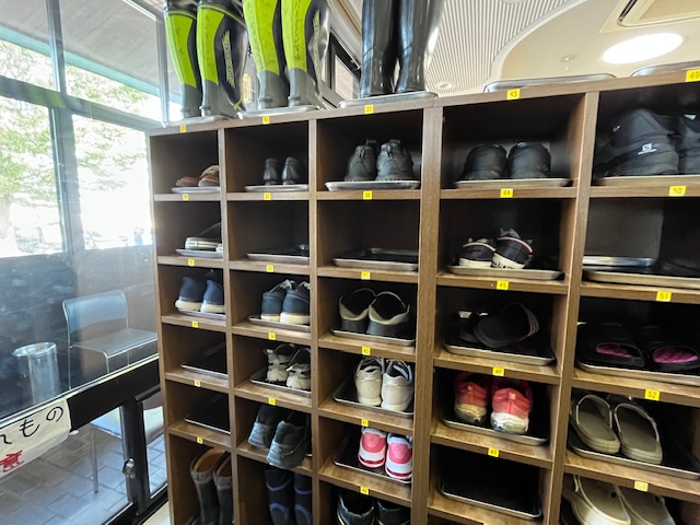 靴は平置きの靴棚に置くか、ロッカー(コインレス)に収納します。