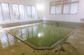 お湯はウグイス色のにごり湯(透明度:50cm)、やや硫黄・ダシ味で複雑な臭い。