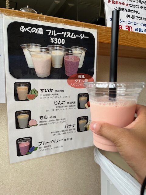 ふくの湯特製のフルーツスムージ(すいか、ブルーベリー、りんご、もも、バナナ)を販売しています。