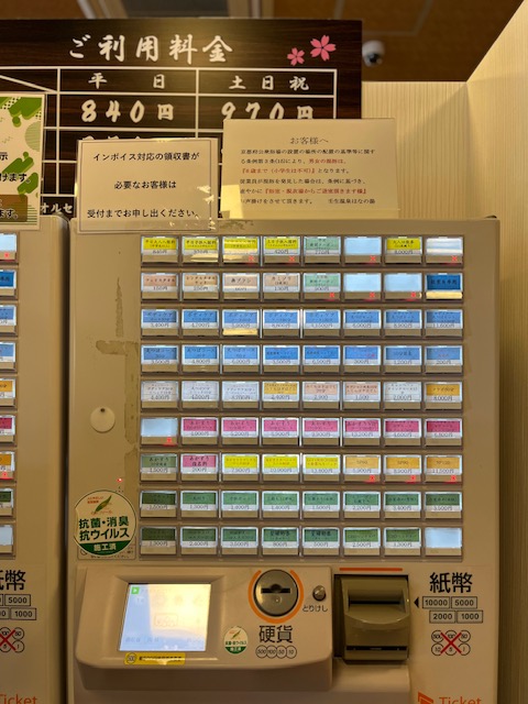 入浴料金は平日840円、土日祝970円でした。券売機で入浴券を購入し、受付に渡します。