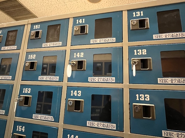 靴は靴箱ロッカー(コインレス)に収納します。靴箱ロッカーのキーは入館時に受付に渡します。