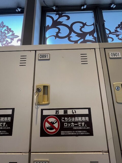 靴は靴箱ロッカーに収納します。靴箱ロッカーのキーは入館時に受付に渡します。