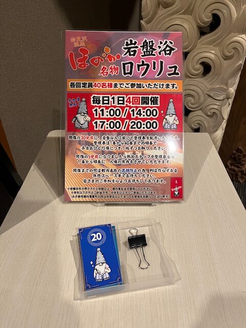 開催30分前に、岩盤浴入口前で整理券が配布されます。配布5分前くらいから看板前で待機する方をチラホラ見かけました。