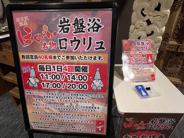 開催30分前に、岩盤浴入口前で整理券が配布されます。配布5分前くらいから看板前で待機する方をチラホラ見かけました。