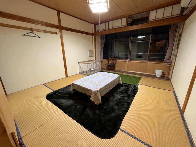 お部屋の全体はこんな感じ。8畳+α の和室で、テレビはありません。お布団は押入れにありますので、自分で敷きます。