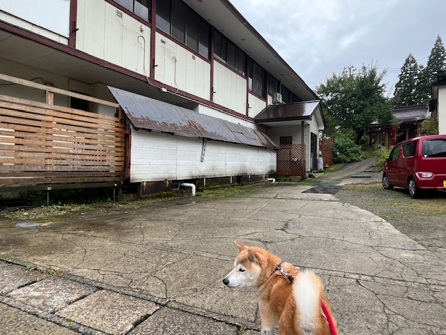 駐車場から見たお宿の建物。左側が受付のある新館、右側がペット同室専用部屋のある本館です。