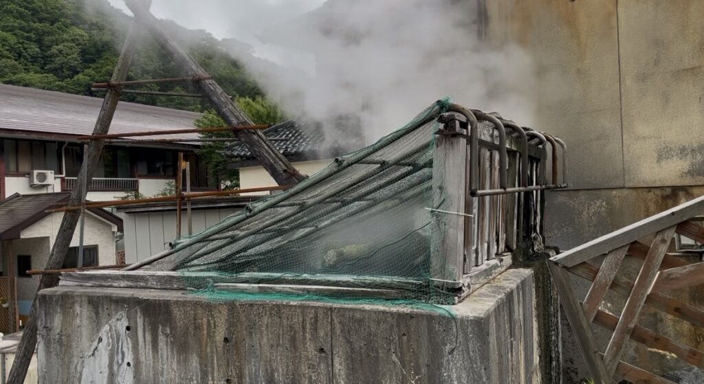 源泉槽あり。湯けむりがモウモウと立ちのぼり、温泉がゴボゴボ湧いています。
