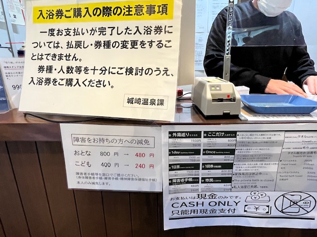 受付にてQR付の入浴券を現金で購入します。