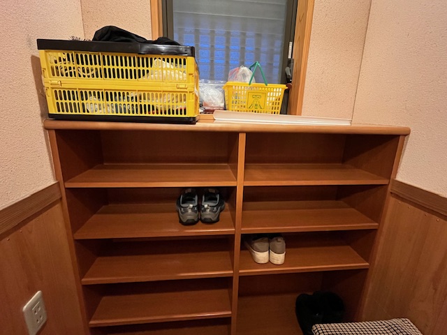 靴は男女別の入口の先、平置きの靴棚に置きます。