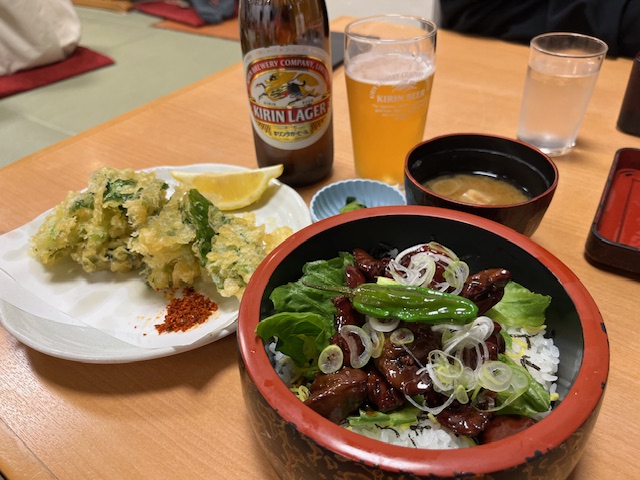 この日は鳥もつ煮の丼物とみたま菜(野沢菜)唐揚げ(+瓶ビール)をいただきました。