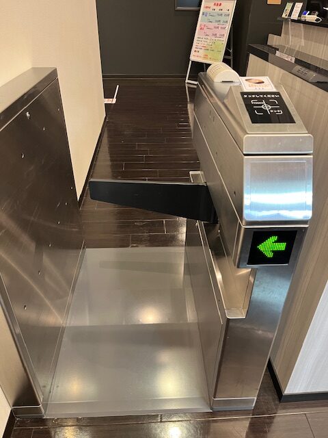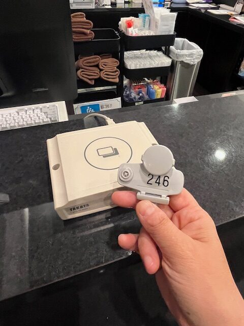 靴箱ロッカー(小銭不要)のカギにIC機能がついており、入館手続きや退館時のゲート通過時、食事処や自動販売機利用の際に利用します。