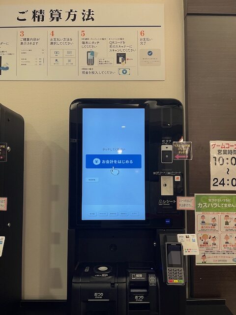 退館時に自動精算機にICをかざして館内で利用した料金を一括精算します。
