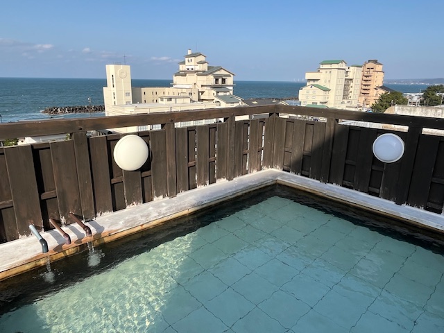 屋根がないので、開放感抜群!! 長湯に適した湯温で、海風も気持ち良く、非常にリラックスできました。
