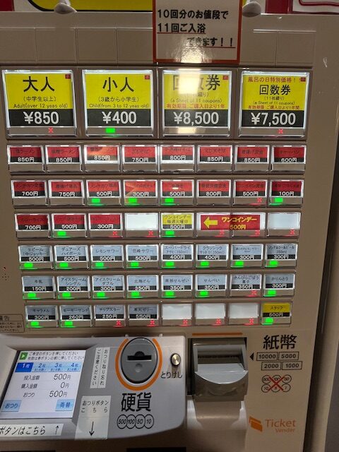 入浴料金は火曜日のワンコインデーだったため、500円でした(通常:850円)。券売機で入浴券を購入し、受付に渡します。