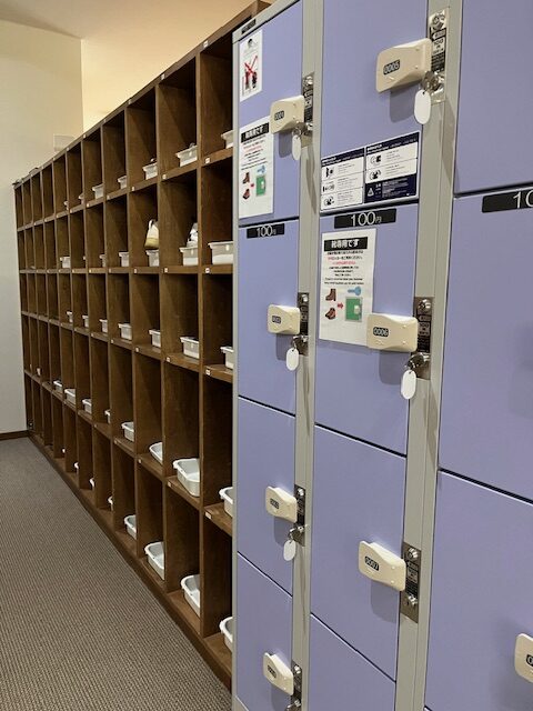 靴は無料の靴箱があります。なお靴専用コインロッカー(100円ノーリターン式)もあります。