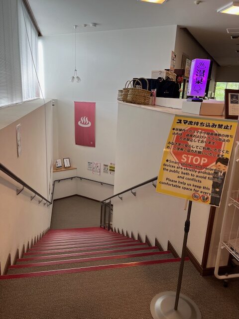 受付を済ませて脱衣所・浴室へ向かう下り階段の前で、スマホは貴重品ロッカーに収納します。